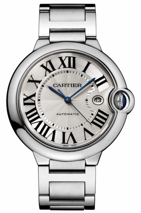 Parfaitement, les fausses Cartier avec cadrans en argent en ligne maintiennent des chiffres romains noirs et des aiguilles bleues.